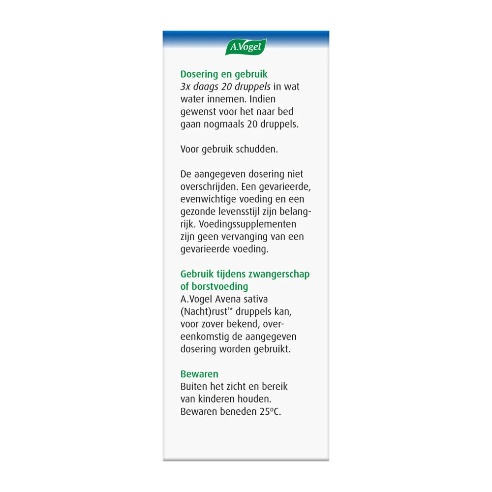 A.Vogel Avena Sativa (nacht)rust druppels  A.Vogel Avena sativa (Nacht)rust1*druppels bevat Avena sativa, dat helpt om lichaam en geest te ontspannen*. Het helpt ook om lekker te slapen*.Bij innerlijke onrust*Evenwichtig in stresssituaties1*Helpt om lekker te slapen1*VoedingssupplementKruidenpreparaat1Haverextract (Avena sativa). *Gezondheidsclaim in afwachting van Europese toelating.