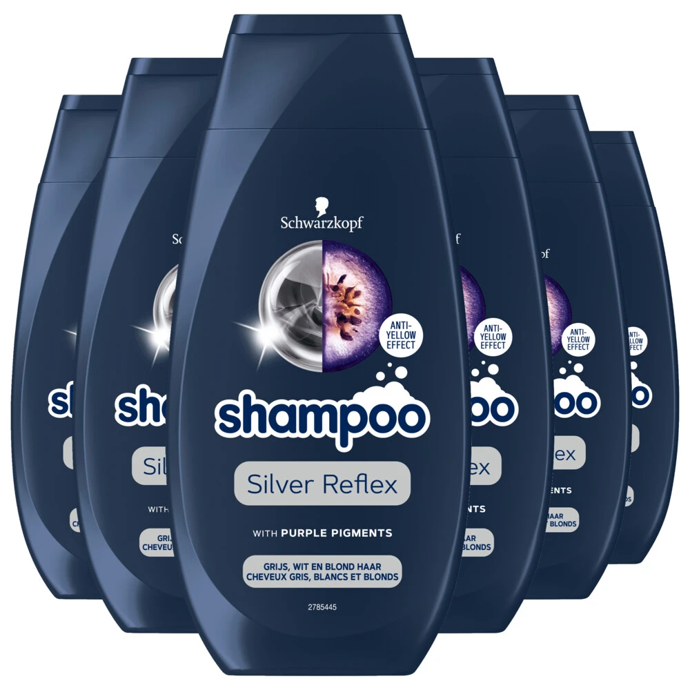 Schwarzkopf Silver Reflex ShampooDe Silver Reflex shampoo bevat paarse pigmenten en geeft een anti-geel effect aan het haar. De formule is vegan en beschermt tegen vervaging en verkleuring. Geschikt voor blond, grijs & wit haar. De shampoo neutraliseert de gele gloed uit blond, grijs of wit haar.De formule versterkt en voedt het haar tot in de punten.De shampoo bevat paarse pigmenten.Zorgt voor een anti-geel effect.Alle shampoos van Schwarzkopf zijn vegan.De fles is gemaakt van 50