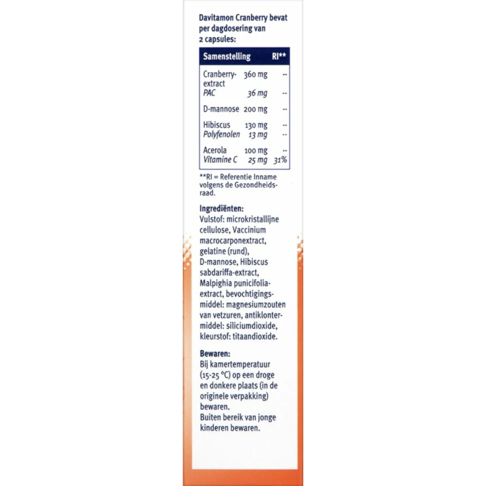 Davitamon CranberryHet voedingssupplement Cranberry van Davitamon bevat cranberry, D-mannose, hibiscus en vitamine C uit acerola. Hibiscus draagt bij aan een goede blaasfunctie, het helpt de blaas schoon te houden en verhoogt de weerstand van de blaas*. Vitamine C, gewonnen uit acerola, is een antioxidant die mede helpt de weerstand goed te houden. D-mannose is een natuurlijke suiker dat ook voorkomt in fruit zoals sinaasappels en bepaalde bosbessen.Davitamon Cranberry in het kortVerhoogt de wee