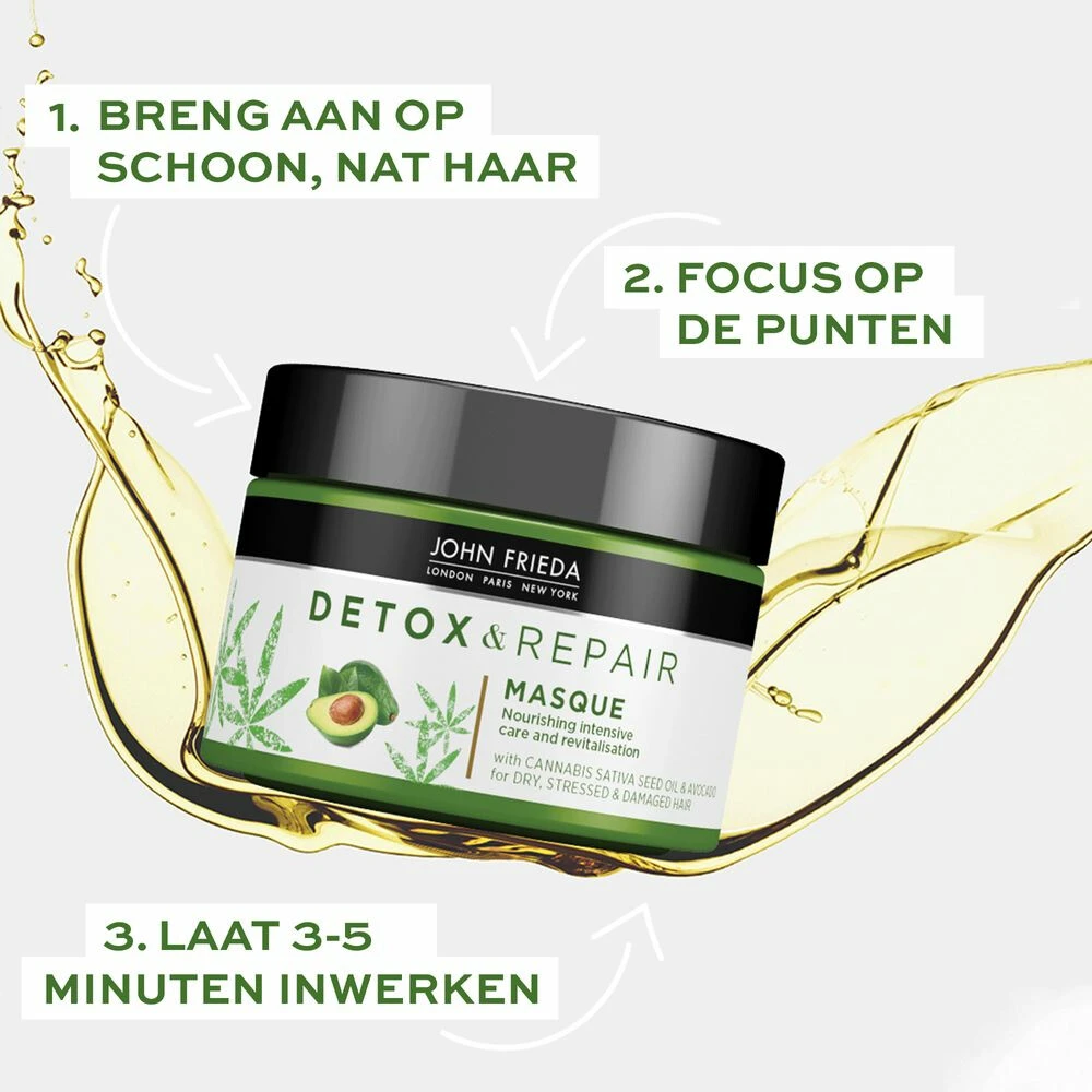 John Frieda Detox & Repair MasqueJohn Frieda Detox & Repair Masker is speciaal ontwikkeld voor droog, gestresst of beschadigd haar. Dit masker, verrijkt met cannabis sativa zaad olie & avocado, biedt intensieve  hydratatie en diepe verzorging voor gezond ogend haar. Voor zichtbaar hersteld en zacht haar. Is speciaal ontwikkeld voor droog of beschadigd haarVerrijkt met avocado-olie en groene thee-extract transformeert je haar tot gezond ogend haar met meer volume en een zach