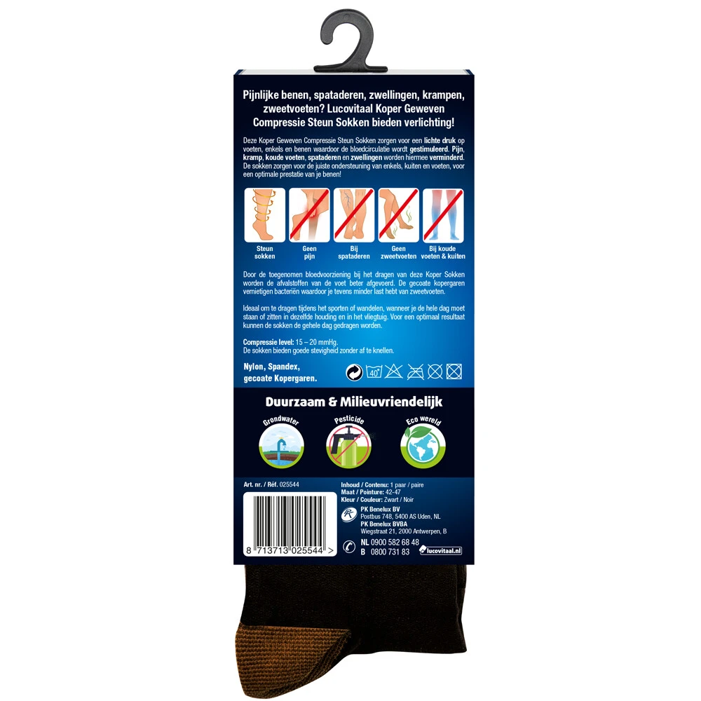 Koper Geweven Zwarte Compressie Steun SokkenLucuvitaal Koper Geweven Compressie Steun Sokken maat 42-47 zorgen voor een lichte druk op voeten, enkels en benen en geven een therapeutische ondersteuning. De sokken zijn ideaal om te dragen tijdens het sporten of wandelen, wanneer je de hele dag moet staan of zitten in dezelfde houding en tijdens langere reizen met auto, bus trein of vliegtuig. Voor een optimaal resultaat kunnen de sokken de gehele dag gedragen worden. De sokken zorgen voor de juist