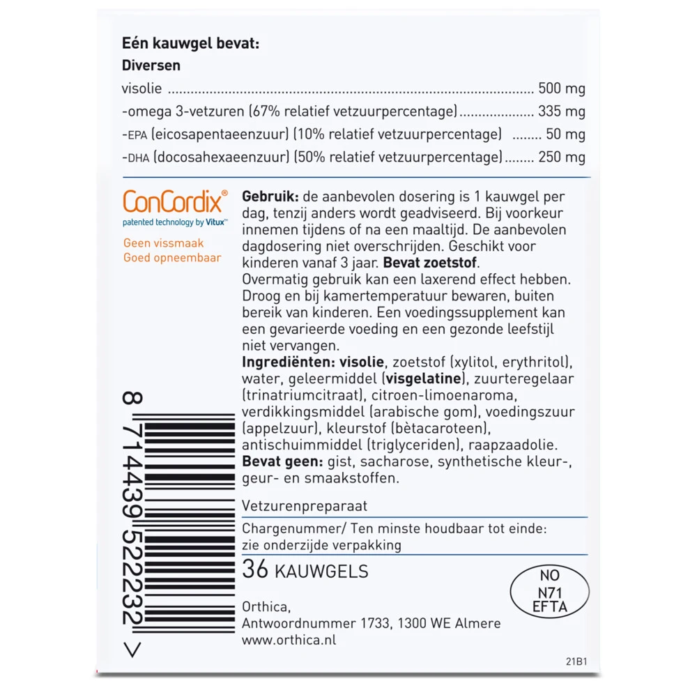 Orthica Dino Omega 3 KauwgelDino Omega 3 van Orthica is speciaal voor kinderen vanaf 3 jaar. Niet alle kinderen eten genoeg vis om voldoende EPA en DHA binnen te krijgen. De Dino Omega 3 is in dat geval een prima aanvulling want het bevat een hoge dosering EPA en DHA namelijk 335 mg omega 3-vetzuren (EPA en DHA) per kauwgel. DHA is een belangrijke bouwsteen voor de hersenen² en DHA is goed voor het gezichtsvermogen².Dino Omega 3 heeft een frisse citroen-limoensmaak. Dino Omega 3 r