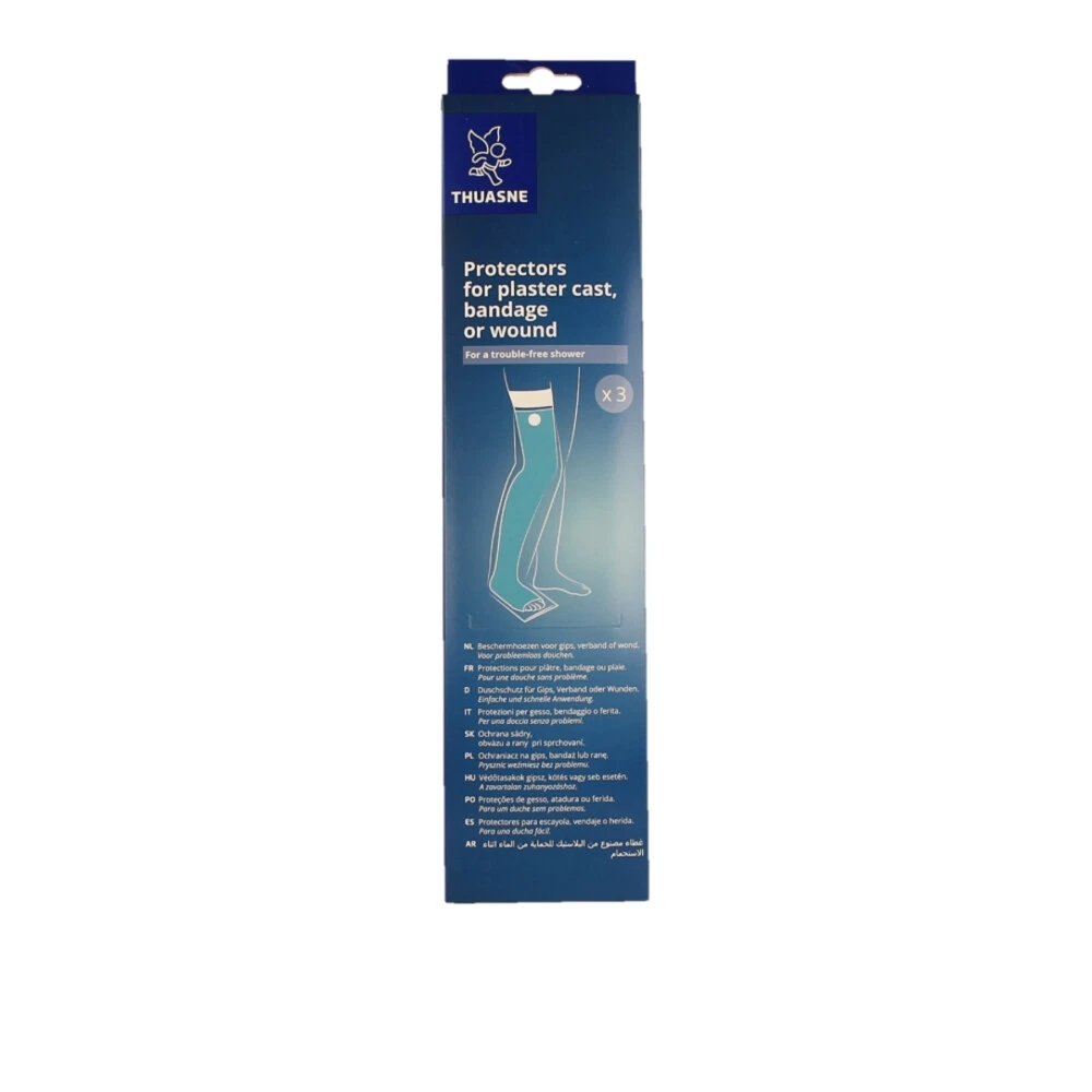 Probleemloos douchen met Thuasne Beschermhoes BeenThuasne Beschermhoes Been beschermt het gips, verband of een wond tijdens het douchen als deze niet nat mag worden. De hoes is voorzien van soort tape zodat je de hoes makkelijk kunt bevestigen en het gips, verband of een wond kunt beschermen tegen waterspatten.De verpakking bevat 3 hoezen die geschikt zijn voor de bescherming van het been.