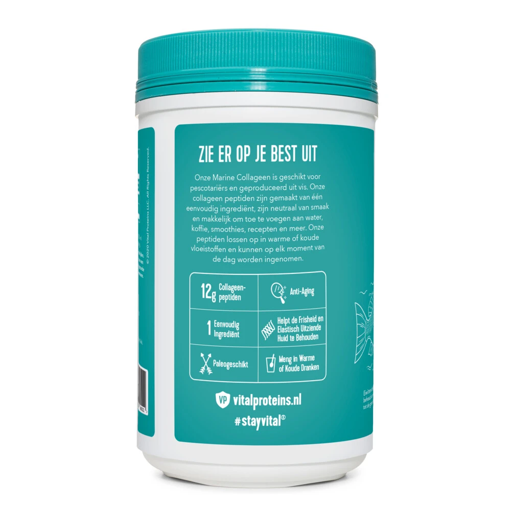 Vital Proteins Marine Collageen Vital Proteins Marine Collageen is een premium eiwit dat gemaakt is van zeedieren. Marine Proteins Collageen – een niet-gearomatiseerd poeder bevat 12 g hoogwaardige witte viscollageenpeptiden per portie.Collageen is een belangrijk structureel eiwit dat prominent aanwezig is in je haar, huid en nagels, maar ook in bindweefsel, pezen, ligamenten en botten.Ondersteunt gezond haar, huid, nagels en gewrichtenBiobeschikbaar:  verteerd en snel opgenomen door h